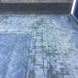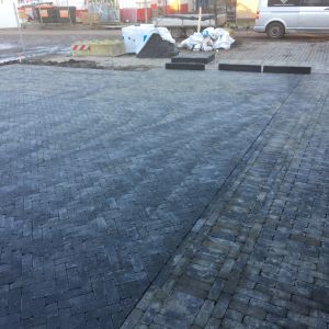 Oprit in keperverband bestraat met getrommelde dikformaat in de kleur antraciet. Om het af te maken met een mooie rollaag om de bestrating heen.