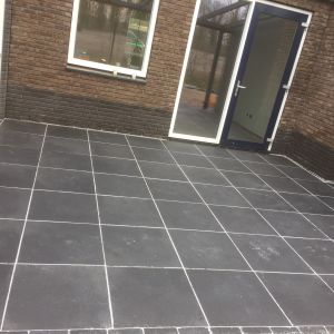 Het terras hebben we bestraat met een mooie gecoate 60x60 tegel en gevoegd met een epoxyvoeg voor een strak eindresultaat.
